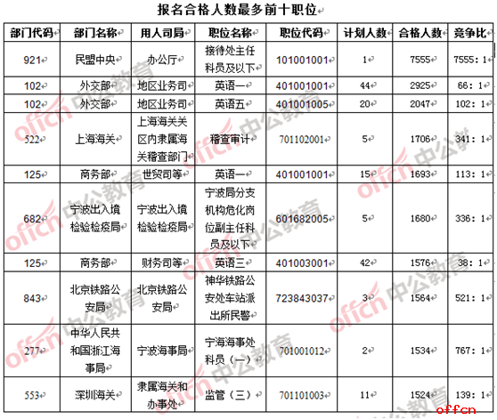 來(lái)自民盟中央辦公廳接待處主任科員及以下(職位代碼為101001001)一職繼續(xù)"霸占"最熱職位的"頭把交椅",巋然不動(dòng),該職位招錄1人,目前過(guò)審人數(shù)為7555人,今日增長(zhǎng)1000余人,增幅較前兩日有所放緩,但此職位在一個(gè)周末2日的時(shí)間內(nèi)增長(zhǎng)3784人,其中不排除"上班族"對(duì)國(guó)考的"滿腔熱情",還有一個(gè)重要原因就是報(bào)名已近尾聲,持"觀望"態(tài)度的考生終于開(kāi)始"下手",不排除有相當(dāng)一部分是為熟悉國(guó)考的導(dǎo)向以及考試氛圍,為來(lái)年的省考做準(zhǔn)備的考生。