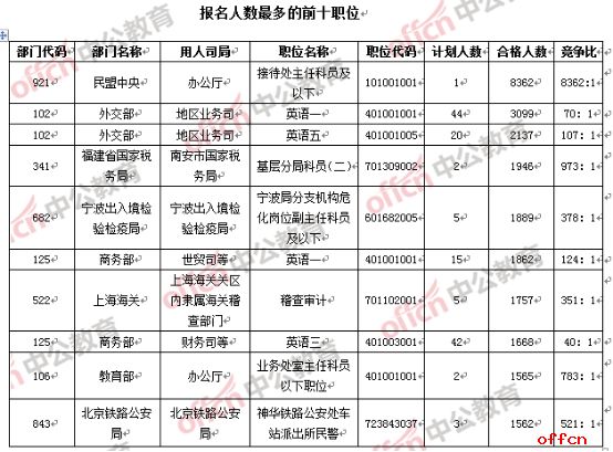 從報考人數(shù)上來看,截止24日8時,34個職位已經(jīng)“破千”,其中,3個職位的報名人數(shù)已經(jīng)2000千,而外交部地區(qū)業(yè)務司英語一(職位代碼401001001)一職成為今年第二個了3000大關的職位;從競爭比上來說,除民盟中央辦公廳接待處主任科員及以下(職位代碼為101001001)一職位于難以企及的“八千挑一”的高峰之外,另外,還有8個職位是“千里挑一”的職位,這與去年同期相比,前十個職位競爭比都在1107:1之上相較,今年報考“冷熱兩重天”的特點異常顯著,中公教育專家提醒考生,在選擇職位準備“下手”時,一定要保持頭腦清醒,切勿盲目跟風。