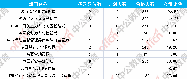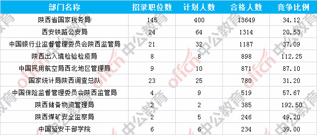 為幫助廣大考生更清晰的了解今日報名情況,陜西中公網(wǎng)校整理了審核通過人數(shù)前十位的部門以及競爭比例最激烈的十大部門,供廣大考生參考: