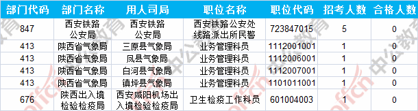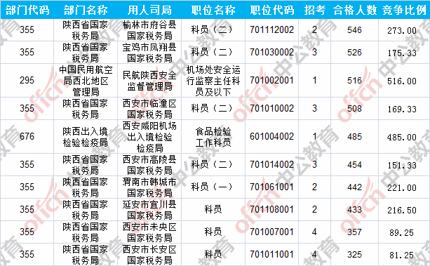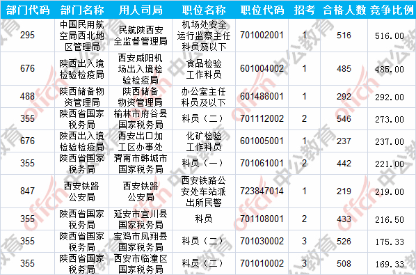 報名通過審核人數(shù)前十的職位主要集中在陜西省國家稅務(wù)局、中國民用航空局西北地區(qū)管理局、陜西出入境檢驗檢疫局等部門,具體信息如下: