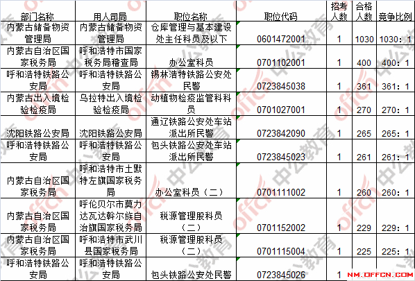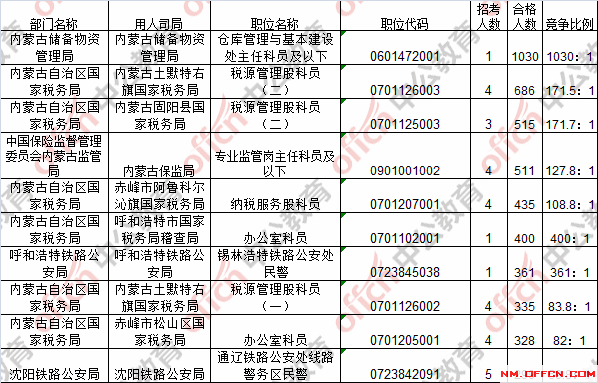 報(bào)名通過(guò)審核人數(shù)前十的職位主要集中在內(nèi)蒙古儲(chǔ)備物資管理局、內(nèi)蒙古土默特右旗國(guó)家稅務(wù)局、內(nèi)蒙古固陽(yáng)縣國(guó)家稅務(wù)局等部門(mén),具體信息如下: