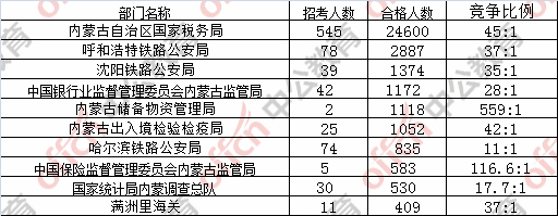 截至24日8時(shí),國(guó)家公務(wù)員考試報(bào)名最后一天,據(jù)內(nèi)蒙古中公網(wǎng)校統(tǒng)計(jì),2017國(guó)考招錄職位中工作地點(diǎn)在內(nèi)蒙古的職位通過(guò)審核總?cè)藬?shù)為35810,共有19個(gè)職位無(wú)人通過(guò)審核,平均競(jìng)爭(zhēng)比例為39:1。