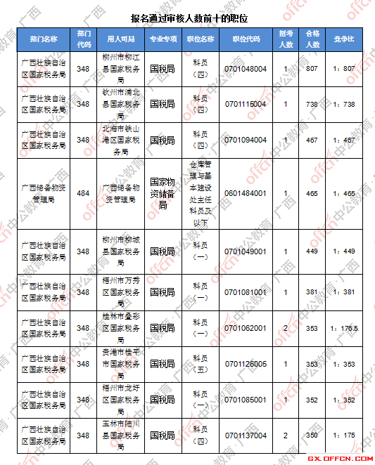 報名通過審核人數(shù)前十的職位主要集中在廣西壯族自治區(qū)國家稅務(wù)局、廣西儲備物資管理局等部門,具體信息如下:
