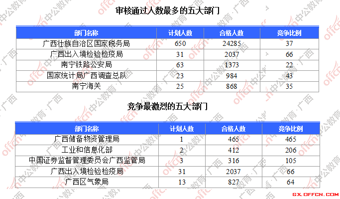 為幫助廣大考生更清晰的了解今日報名情況,廣西中公網(wǎng)校整理了審核通過人數(shù)前五位的部門以及競爭比例最激烈的五大部門,供廣大考生參考: