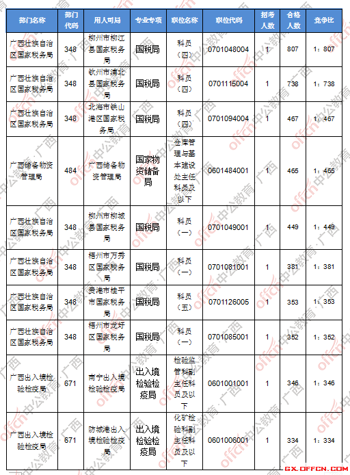 截止到24日8時,競爭比例的職位為柳州市柳江縣國家稅務(wù)局科員(四)一職,招錄1人,通過人數(shù)為807人,競爭比例807:1。