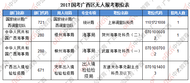 截止到24日8時,工作地點在廣西的職位共有4個無人報考,僅占全部職位的0.6%。下面是部分廣西無人報考職位一覽表,廣西中公網(wǎng)校專家建議廣大考生結(jié)合自身條件,根據(jù)自己的實際情況找到屬于自己的職位,避免激烈競爭。