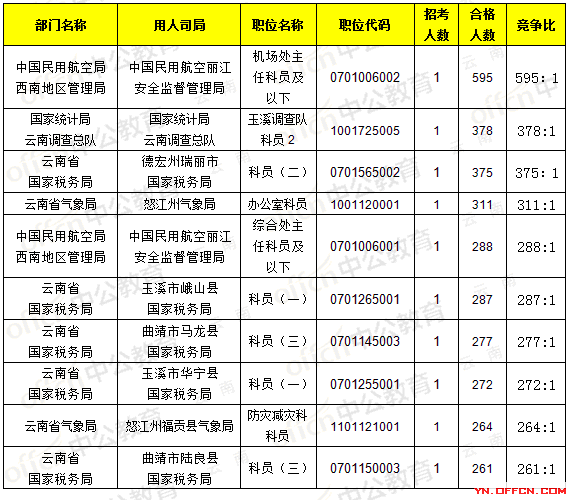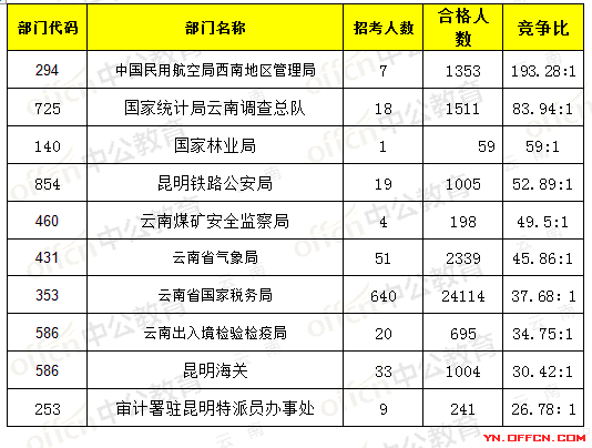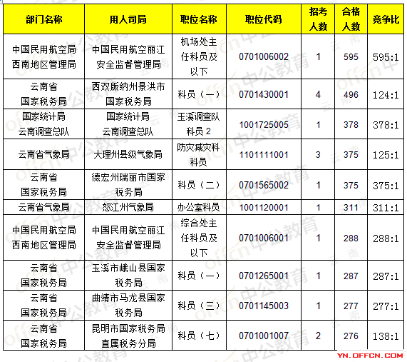 報名通過審核人數(shù)前十的職位主要集中在中國民用航空局西南地區(qū)管理局、云南省國家稅務局、國家統(tǒng)計局云南調(diào)查總隊等,具體信息如下: