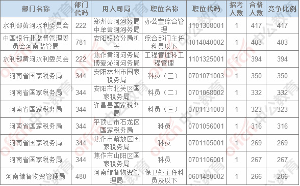 截止24日8時,招錄比例的職位為鄭州黃河河務局中牟黃河河務局辦公室綜合管理一職,招錄1人,截止24日8時通過人數(shù)為417人。