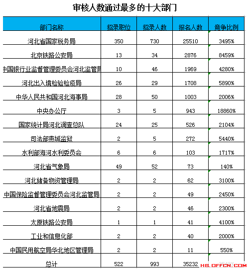 截止到24日8時,通過審核人數(shù)前三位的部門依次是:河北省國家稅務局、北京鐵路公安局、中國銀行業(yè)監(jiān)督管理委員會河北監(jiān)管局,三部門通過審核總?cè)藬?shù)達30355人,占通過審核總?cè)藬?shù)的86%。