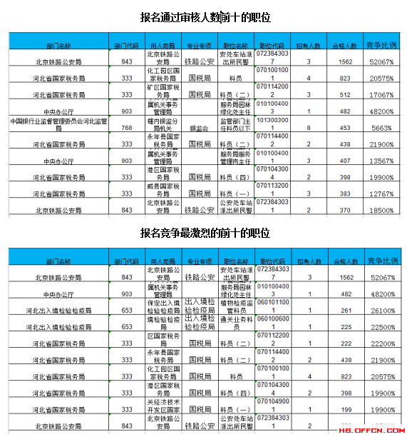 報名通過審核人數(shù)前十的職位主要集中在北京鐵路公安局、河北省國家稅務局、中央辦公廳等部門,具體信息如下: