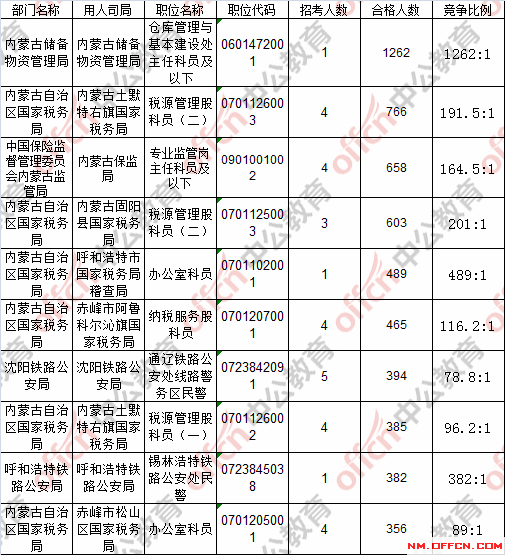 截止到24日17:30時,競爭比例的職位為內(nèi)蒙古儲備物資管理局倉庫管理與基本建設(shè)處主任科員及以下一職,招錄1人,截止到24日17:30時通過人數(shù)為1262人!
