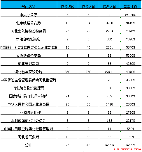 截止到24日17:30時,通過審核人數(shù)前三位的部門依次是:河北省國家稅務(wù)局、北京鐵路公安局、中國銀行業(yè)監(jiān)督管理委員會河北監(jiān)管局,三部門通過審核總?cè)藬?shù)達(dá)35462人,占通過審核總?cè)藬?shù)的84%。
