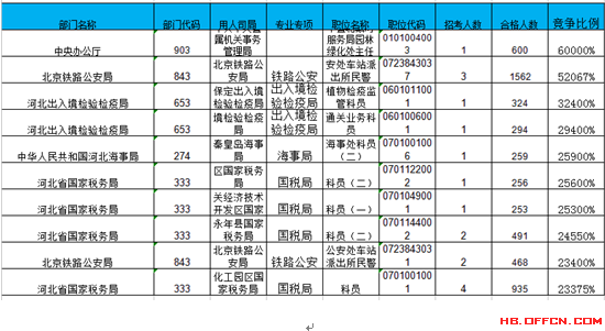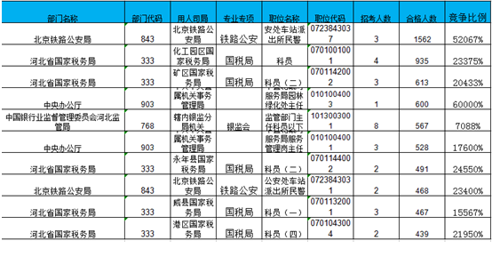 報名通過審核人數(shù)前十的職位主要集中在北京鐵路公安局、河北省國家稅務(wù)局、中央辦公廳等部門,具體信息如下: