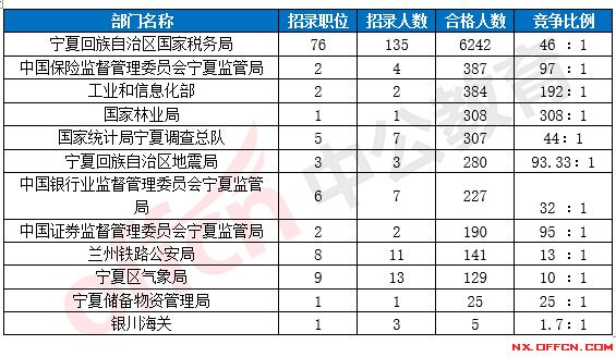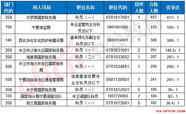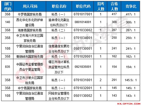 合格人數(shù)前十的職位主要集中在寧夏回族自治區(qū)國(guó)家稅務(wù)局、工業(yè)和信息化部、國(guó)家林業(yè)局等部門,具體信息如下: