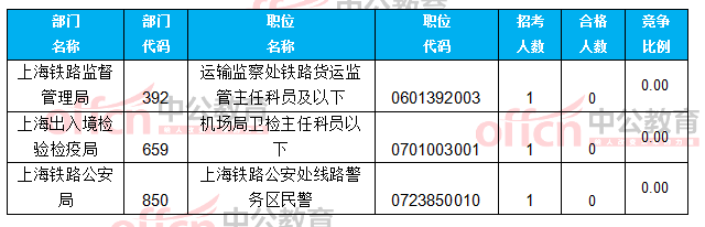 截止到24日18時,工作地點在上海的職位共有3個無人報考,占全部職位的0.88%。下面是無人報考職位一覽表,中公網(wǎng)校專家建議廣大考生多關(guān)注一些較冷職位,避免激烈競爭,結(jié)合自身條件,找到屬于自己的職位。
