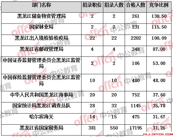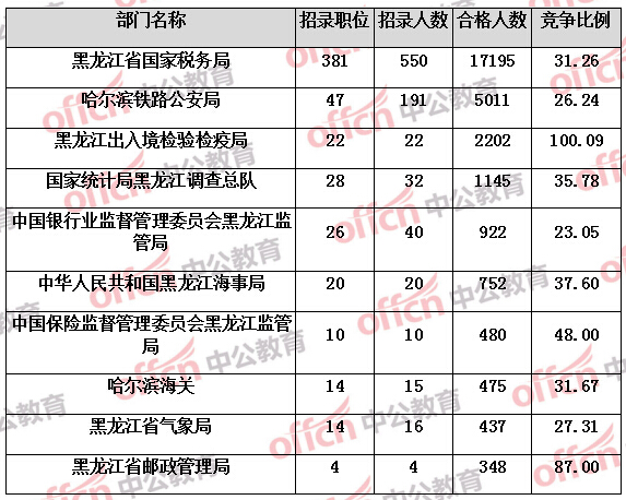 為幫助廣大考生更清晰的了解今日?qǐng)?bào)名情況,黑龍江中公網(wǎng)校整理了審核通過人數(shù)前六位的部門以及競爭比例最激烈的十大部門,供廣大考生參考:
