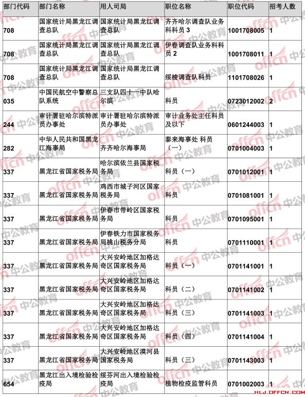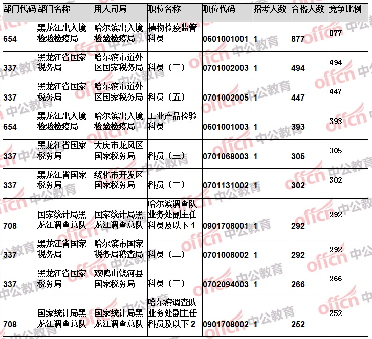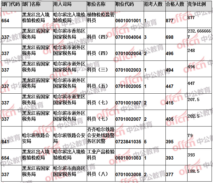 報(bào)名通過審核人數(shù)前十的職位主要集中在黑龍江省國家稅務(wù)局、黑龍江出入境檢驗(yàn)檢疫局、哈爾濱鐵路公安局等部門,具體信息如下: