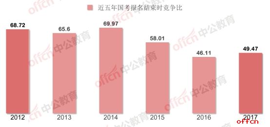 從近六年國考報(bào)名結(jié)束時(shí)的競爭比來看,2014國考,接近70:1,但2014年總招錄人數(shù)不足2萬人,今年國考接近三萬人,依然以接近50:1的高競爭比與歷年國考匹敵,尤其是超越了去年的46:1。中公網(wǎng)校專家大膽,今年最終的報(bào)名過審人數(shù)或趕超2014國考,成為歷史值。