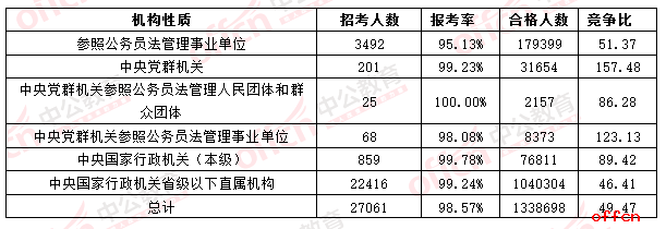 從五大系統(tǒng)分析,僅有中央黨群機(jī)關(guān)參照公務(wù)員法管理人民團(tuán)體和群眾團(tuán)體博考慮達(dá)到百分之百,中央黨群機(jī)關(guān)、中央黨群機(jī)關(guān)參照公務(wù)員法管理事業(yè)單位和中央國家行政機(jī)關(guān)(本級)這三個(gè)系統(tǒng)均留下一個(gè)“老大難”職位,其中,中央黨群機(jī)關(guān)參照公務(wù)員法管理事業(yè)單位和中央黨群機(jī)關(guān)兩個(gè)系統(tǒng)的競爭比例超過了100:1,分別為123.13、157.48,可見中央黨群是考生偏愛的對象。