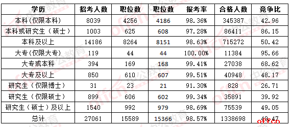 從各學(xué)歷報(bào)考情況來看,要求大專(僅限大專)學(xué)歷的職位的報(bào)考率達(dá)到了100%,要求為大?;虮究茖W(xué)歷的共計(jì)169個(gè)職位,僅剩1個(gè)職位無人報(bào)考。競爭比的是要求大專(僅限大專)的職位,競爭比高達(dá)95.66:1,基本上接近百里挑一。學(xué)歷要求越高競爭比越低,要求博士研究生學(xué)歷的職位競爭比最低,僅為26.7:1。