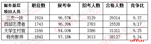 總體來看,要求四項(xiàng)目人員的職位報(bào)考率都很高,除了大學(xué)生村官職位低于95%以外剩下的均在95%以上,且四項(xiàng)目人員職位競爭比較低,均在9:1左右。