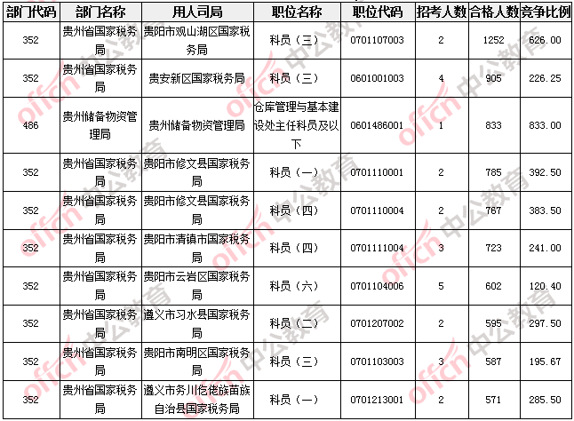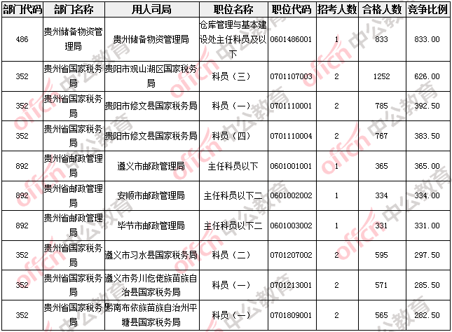 報名通過審核人數(shù)較多的職位主要集中在貴州省國家稅務局、貴州儲備物資管理局兩大部門,具體信息如下: