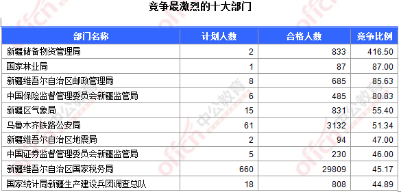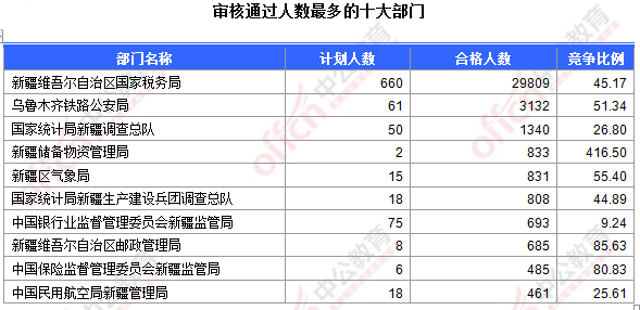 為幫助廣大考生更清晰的了解今日報名情況,新疆中公網(wǎng)校整理了審核通過人數(shù)前十位的部門以及競爭比例最激烈的十大部門,供廣大考生參考:
