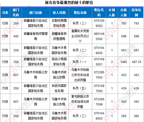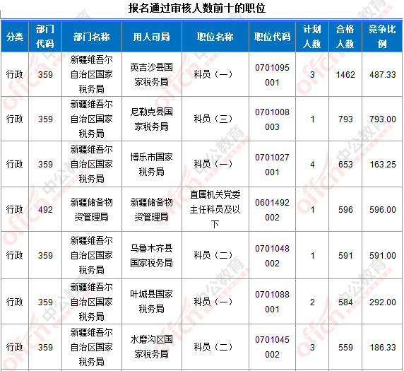 報名通過審核人數(shù)前十的職位主要集中在新疆維吾爾自治區(qū)國家稅務(wù)局、新疆儲備物資管理局、烏魯木齊鐵路公安局部門,具體信息如下: