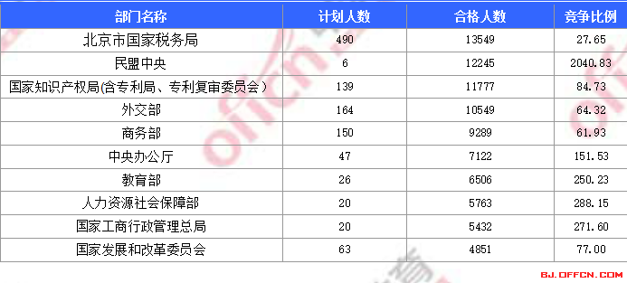 為幫助廣大考生更清晰的了解今日報名情況,中公網(wǎng)校中公教育整理了合格人數(shù)前十位的部門以及競爭比例最激烈的十大部門,供廣大考生參考: