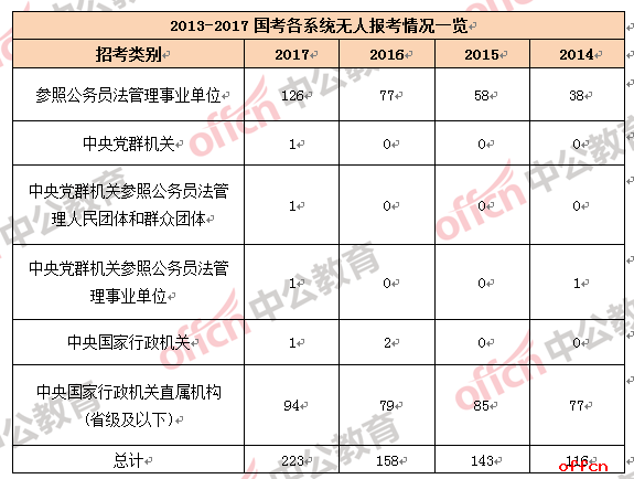 本次國考共223個(gè)職位無人通過審核,其中,數(shù)量較多的系統(tǒng)為中央國家行政機(jī)關(guān)直屬機(jī)構(gòu)(省級(jí)及以下)和參照公務(wù)員法管理事業(yè)單位,分別有94、126個(gè)職位暫無審核通過人數(shù),其余系統(tǒng)均僅有1職位未破零。從近四年的無人報(bào)考數(shù)據(jù)來看,2017年無人報(bào)考的職位大大遠(yuǎn)超往年,這也可以看出,今年報(bào)考的“熱冷兩重天”趨勢非常嚴(yán)峻。