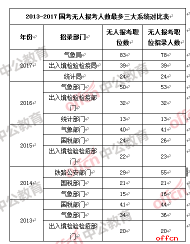 對(duì)比近5年的無人報(bào)考情況,無人通過審核的職位大多來自氣象、出入境檢驗(yàn)檢疫、統(tǒng)計(jì)局三個(gè)部門,而今年無人報(bào)考人數(shù)最多的三大系統(tǒng)與去年相同,但數(shù)量卻有相當(dāng)大的變化,這也預(yù)示著這三個(gè)部門在今年的招錄工作相對(duì)“冷清”。