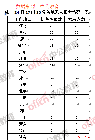 通過中公網(wǎng)校統(tǒng)計(jì)數(shù)據(jù)可以看到,工作地點(diǎn)在河北省的職位無人通過審核數(shù)量最多,為28個(gè)職位,次之是西藏和內(nèi)蒙古,而考生報(bào)考江蘇和重慶兩地的“熱情”相對(duì)“高漲”,只有1個(gè)職位無人報(bào)考。