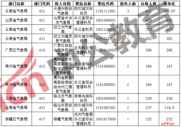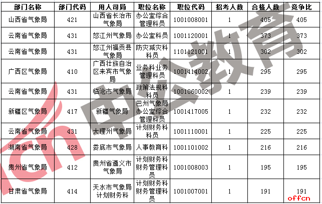 2017國考氣象29個部門共提供個446職位,招錄487人。截至24日17:30,總報名審核通過人數(shù)為11820人,競爭比例為24:1,仍有78個職位無人報考,其余所有職位均有人通過審核。下面是中公網(wǎng)校統(tǒng)計的出入境檢驗檢疫系統(tǒng)報名情況,供考生參考: