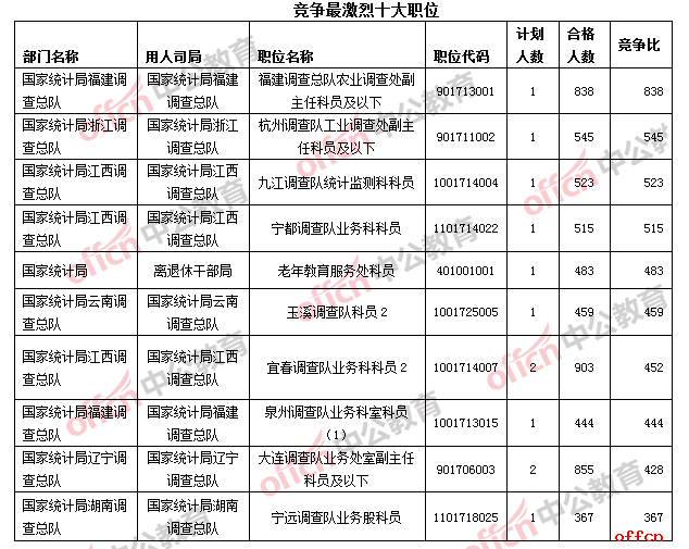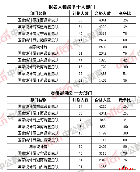 2017國考統(tǒng)計局32個部門共提供744個職位,招錄896人。截至24日17:30,總報名審核通過人數(shù)為45491人,競爭比例為50.77:1,仍有24個職位無人報考,其余所有職位均有人通過審核。下面是中公網(wǎng)校統(tǒng)計的統(tǒng)計局系統(tǒng)報名情況,供考生參考: