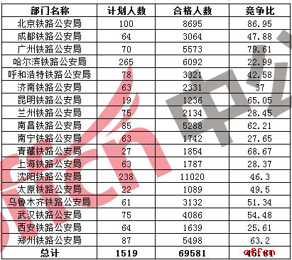 2017國考鐵路公安系統18個部門共提供636個職位,招錄1519人。截至24日17:30,總報名審核通過人數為69581人,競爭比例為45.8:1,仍有4個職位無人報考。下面是中公網校統計的鐵路公安系統報名情況,供考生參考:
