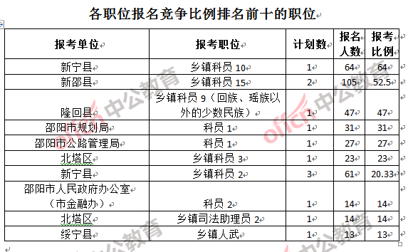 為幫助廣大考生更清晰的了解報(bào)名情況,中公教育整理了邵陽(yáng)市各職位的報(bào)名人數(shù)排名以及競(jìng)爭(zhēng)比例排名,供廣大考生參考: