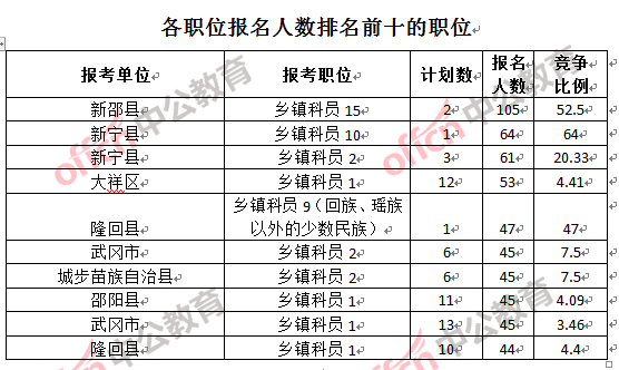 競(jìng)爭(zhēng)熱門職位,前三位依次是:新寧縣鄉(xiāng)鎮(zhèn)科員10(競(jìng)爭(zhēng)比例64:1)、新邵縣鄉(xiāng)鎮(zhèn)科員15(競(jìng)爭(zhēng)比例52.5:1)和隆回縣 鄉(xiāng)鎮(zhèn)科員9(回族、瑤族以外的少數(shù)民族)(競(jìng)爭(zhēng)比例47:1)。