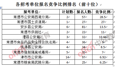競爭熱門招考單位,前三位依次是:常德市公安局西湖分局(競爭比例28.5:1)、常德市國土資源局(競爭比例27:1)和安鄉(xiāng)縣公安局(競爭比例13.5:1)。