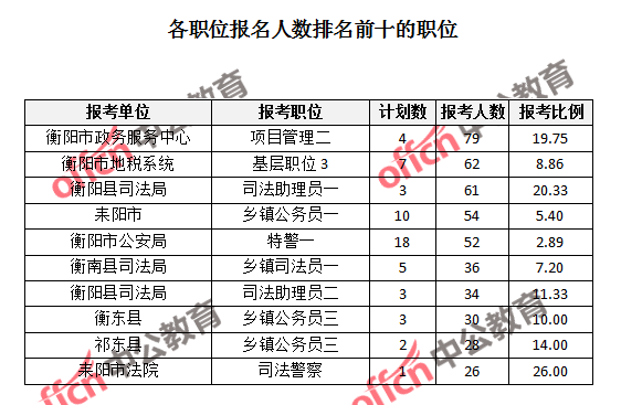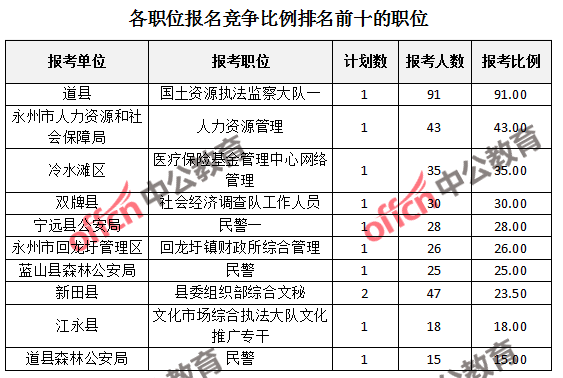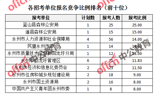 競爭熱門招考單位,前三位依次是:藍山縣森林公安局(競爭比例25:1)、道縣森林公安局(競爭比例15:1)和永州市人力資源和社會局(競爭比例14:1)、民盟永州市委(競爭比例14:1)。