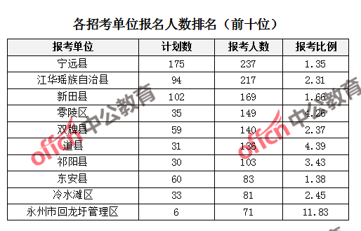 為幫助廣大考生更清晰的了解報名情況,中公教育整理了永州市各招考單位的報名人數(shù)排名以及競爭比例排名,供廣大考生參考: