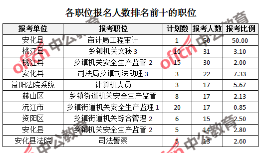 為幫助廣大考生更清晰的了解報名情況,中公教育整理了益陽市各職位的報名人數(shù)排名以及競爭比例排名,供廣大考生參考: