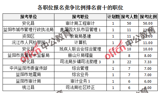 競爭熱門職位,前三位依次是:安化縣審計局工程審計(競爭比例50:1)、益陽市城市管理行政執(zhí)法局直屬四大隊市容管理1(競爭比例11:1)和資陽區(qū)教育局基建(競爭比例11:1)以及沅江市人民檢察院計算機(競爭比例11:1)、安化縣殘疾人聯(lián)合會綜合管理(競爭比例10:1)。