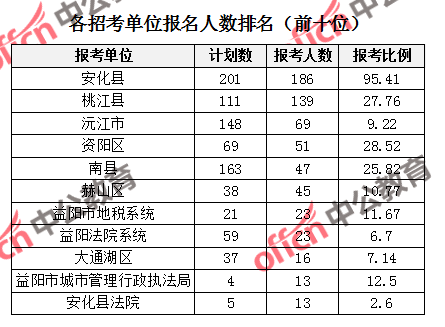 為幫助廣大考生更清晰的了解報名情況,中公教育整理了益陽市各招考單位的報名人數(shù)排名以及競爭比例排名,供廣大考生參考: