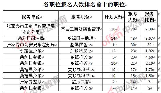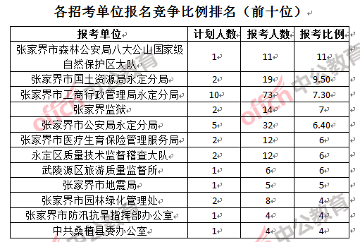 競爭熱門招考單位,前三位依次是:張家界市森林公安局八大公山自然保護(hù)區(qū)大隊(競爭比例11:1)、張家界市國土資源局永定分局(競爭比例9.5:1)和張家界市工商行政管理局永定分局(競爭比例7.3:1)。