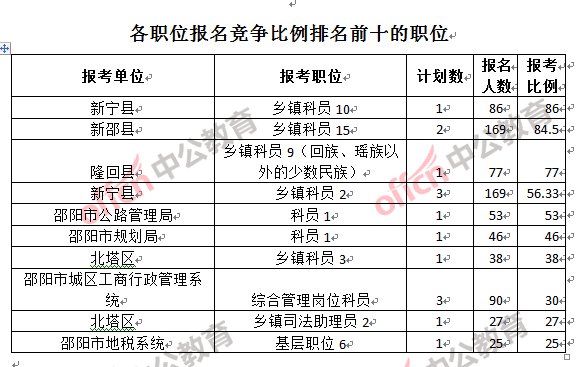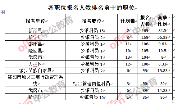 為幫助廣大考生更清晰的了解報名情況,中公教育整理了邵陽市各職位的報名人數(shù)排名以及競爭比例排名,供廣大考生參考: