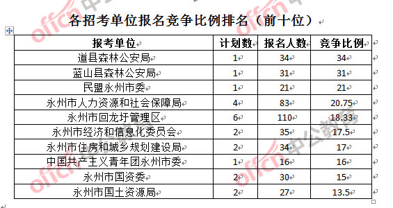 競爭熱門招考單位,前三位依次是:道縣森林公安局(競爭比例34:1)、藍(lán)山縣森林公安局(競爭比例31:1)和民盟永州市委(競爭比例21:1)。