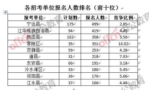 為幫助廣大考生更清晰的了解報名情況,中公教育整理了永州各招考單位的報名人數(shù)排名以及競爭比例排名,供廣大考生參考: