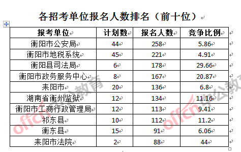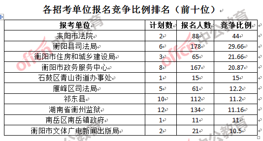 競爭熱門招考單位,前三位依次是:耒陽市法院(市金融辦)(競爭比例44:1)、衡陽縣司法局(競爭比例29.66:1)和衡陽市住房和城鄉(xiāng)建設(shè)局(競爭比例21.66:1)。