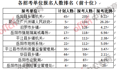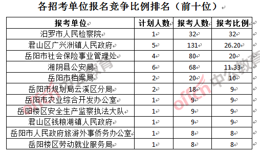 競爭熱門招考單位,前三位依次是:汨羅市人民檢察院(競爭比例32:1)、君山區(qū)廣興洲鎮(zhèn)人民政府(競爭比例26.2:1)和岳陽市社會保險事業(yè)管理處(競爭比例20:1)。