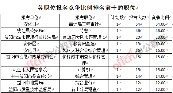 競(jìng)爭(zhēng)熱門職位,前三位依次是:安化縣審計(jì)局工程審計(jì)(競(jìng)爭(zhēng)比例54:1)、桃江縣公安局特警(競(jìng)爭(zhēng)比例46:1)、益陽(yáng)市城市管理行政執(zhí)法局直屬四大隊(duì)市容管理1(競(jìng)爭(zhēng)比例20:1)
